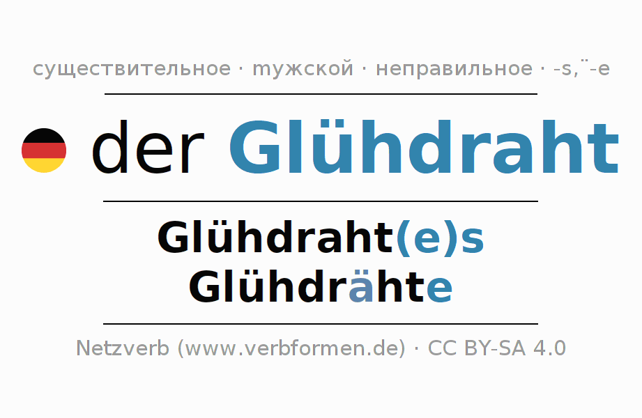 Склонение существительного Glühdraht (нити накаливания, нить нака́ла) даётся в родительном падеже единственного числаGlühdraht(e)s и в именительном падеже множественного числа Glühdrähte. Существительное Glühdraht склоняется по сильному типу, получая окончания es/ä-e. Во множественном числе стоит умлаут. Грамматический род Glühdraht мужской с определённым артиклем "der" Здесь можно просклонять не только Glühdraht, но и все немецкие существительные. Kомментарии ☆