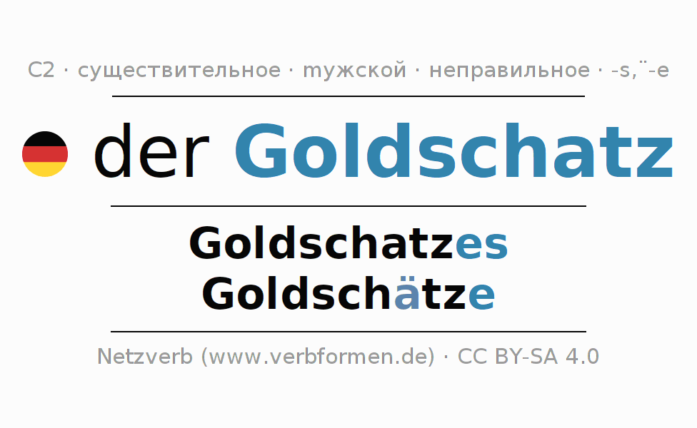 - Единственное число: der Goldschatz, des Goldschatzes, dem Goldschatz(e), den Goldschatz