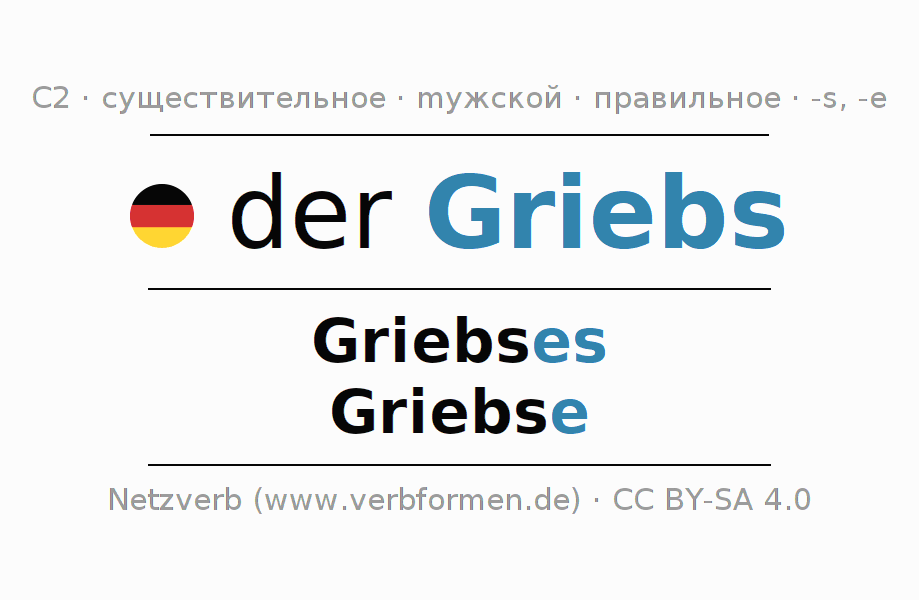 - Единственное число: der Griebs, des Griebses, dem Griebs(e), den Griebs