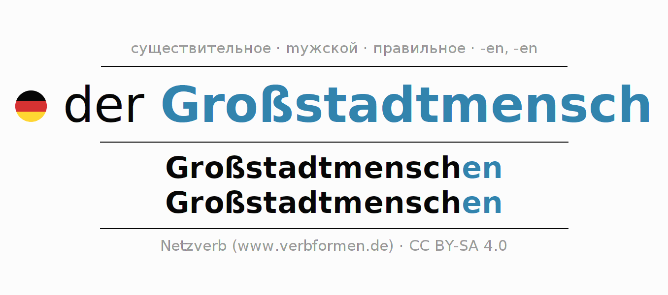 - Единственное число: der Großstadtmensch, des Großstadtmenschen, dem Großstadtmenschen, den Großstadtmenschen
