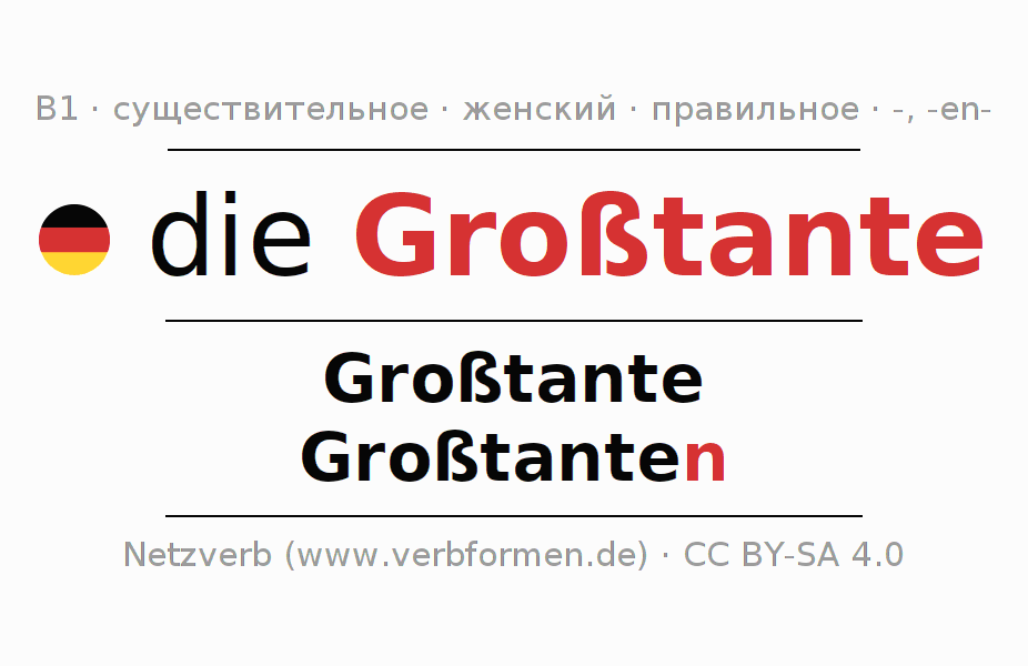 - Множественное число: die Großtanten, der Großtanten, den Großtanten, die Großtanten