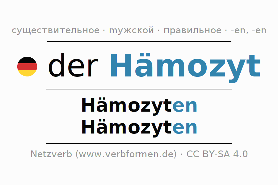 - Единственное число: der Hämozyt, des Hämozyten, dem Hämozyten, den Hämozyten