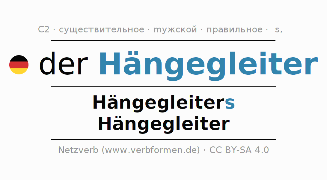 - Единственное число: der Hängegleiter, des Hängegleiters, dem Hängegleiter, den Hängegleiter