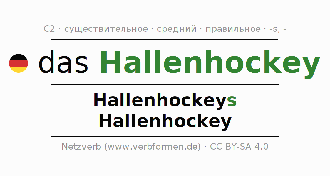 - Множественное число: die Hallenhockey, der Hallenhockey, den Hallenhockey, die Hallenhockey