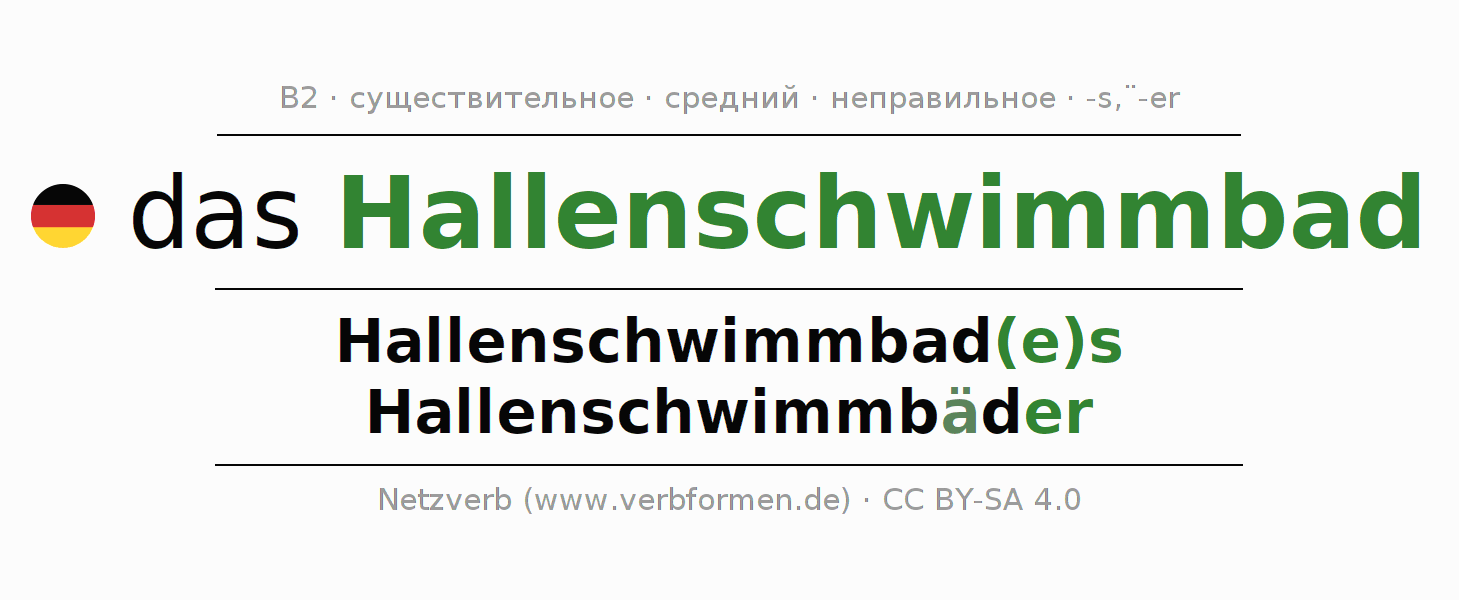- Множественное число: die Hallenschwimmbäder, der Hallenschwimmbäder, den Hallenschwimmbädern, die Hallenschwimmbäder