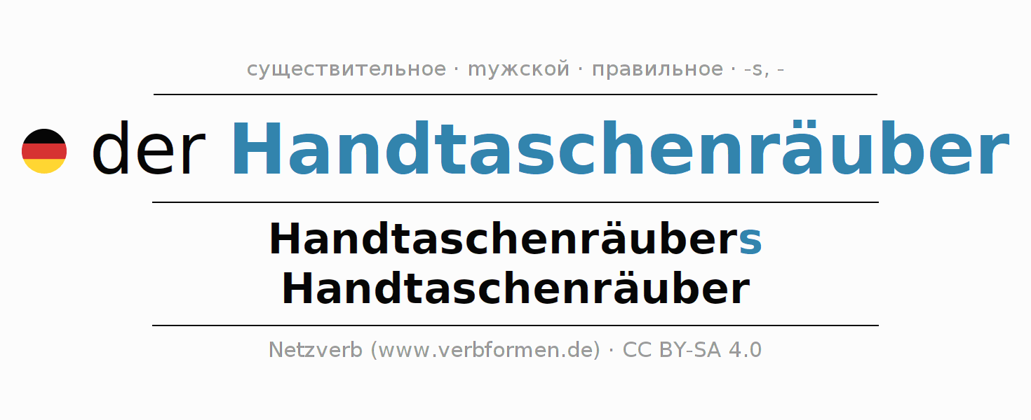 - Единственное число: der Handtaschenräuber, des Handtaschenräubers, dem Handtaschenräuber, den Handtaschenräuber