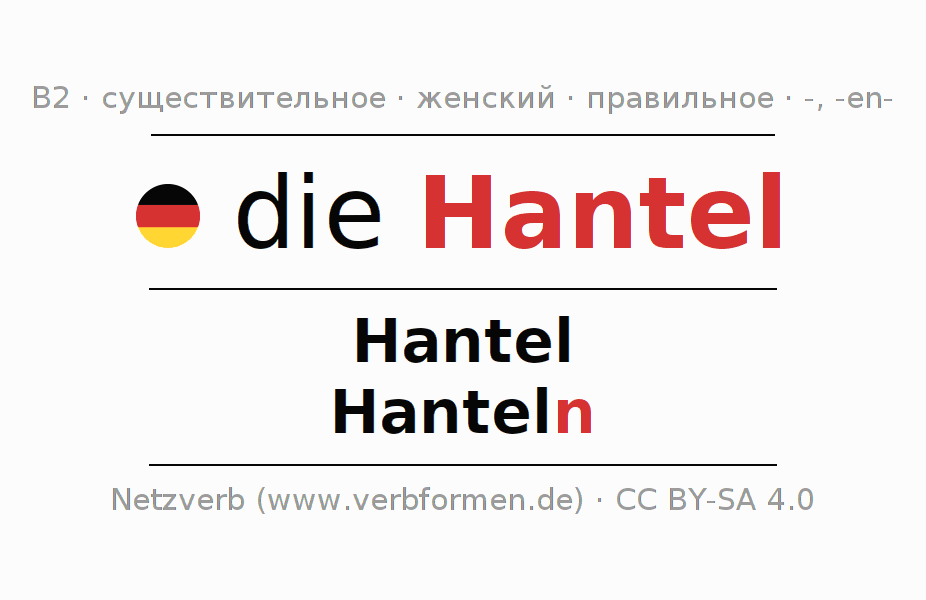 Склонение существительного Hantel (гантель, ганте́ль) даётся в родительном падеже единственного числаHantel и в именительном падеже множественного числа Hanteln. Существительное Hantel склоняется по слабому типу, получая окончания -/n. Грамматический род Hantel женский с определённым артиклем "die" Здесь можно просклонять не только Hantel, но и все немецкие существительные. Существительное включён в словарный запас обладателя сертификата знания немецкого языка уровня B2. Kомментарии ☆