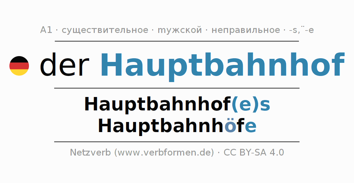 - Множественное число: die Hauptbahnhöfe, der Hauptbahnhöfe, den Hauptbahnhöfen, die Hauptbahnhöfe