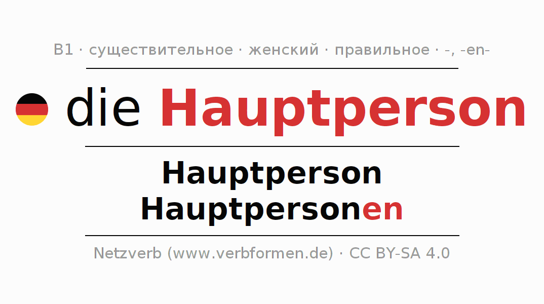 - Множественное число: die Hauptpersonen, der Hauptpersonen, den Hauptpersonen, die Hauptpersonen