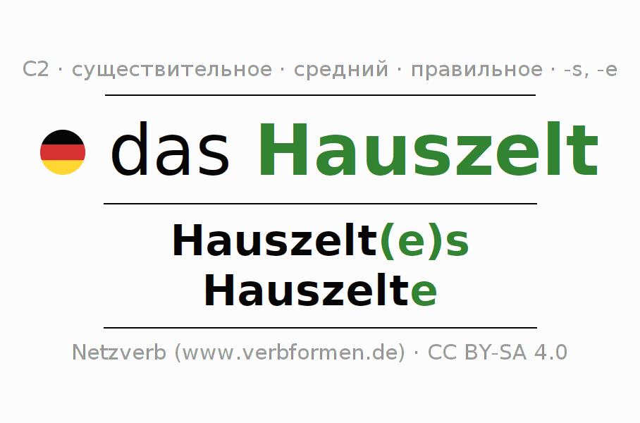 - Множественное число: die Hauszelte, der Hauszelte, den Hauszelten, die Hauszelte