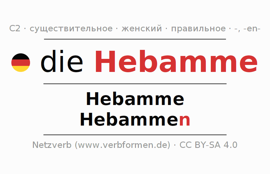 - Единственное число: die Hebamme, der Hebamme, der Hebamme, die Hebamme