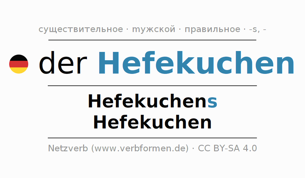 - Множественное число: die Hefekuchen, der Hefekuchen, den Hefekuchen, die Hefekuchen