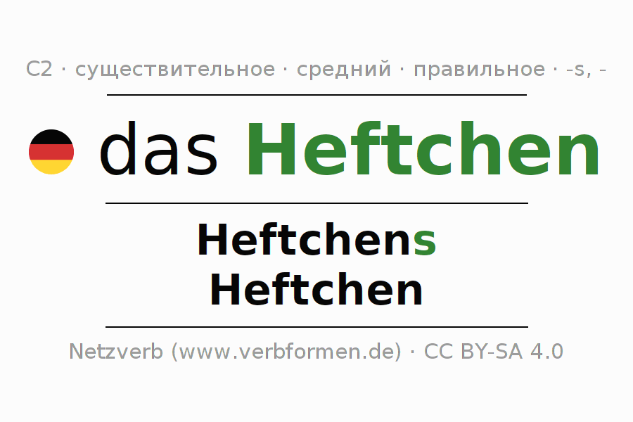 - Единственное число: das Heftchen, des Heftchens, dem Heftchen, das Heftchen