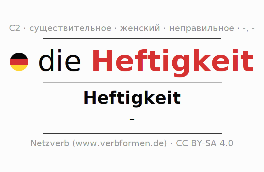 Склонение существительного Heftigkeit (интенсивность, сила) даётся в родительном падеже единственного числаHeftigkeit и в именительном падеже множественного числа -. Существительное Heftigkeit при склонении получает окончания -/-. Не образует форм множественного числа. Грамматический род Heftigkeit женский с определённым артиклем "die" Здесь можно просклонять не только Heftigkeit, но и все немецкие существительные. Существительное включён в словарный запас обладателя сертификата знания немецкого языка уровня C2. Kомментарии ☆