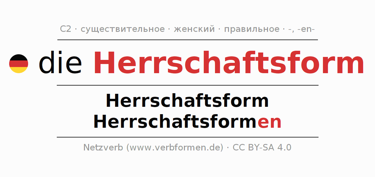 - Единственное число: die Herrschaftsform, der Herrschaftsform, der Herrschaftsform, die Herrschaftsform