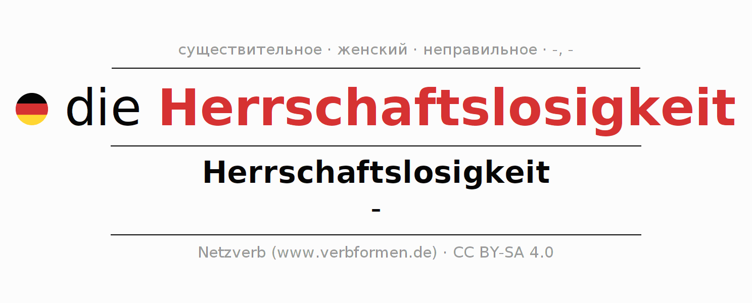 - Единственное число: die Herrschaftslosigkeit, der Herrschaftslosigkeit, der Herrschaftslosigkeit, die Herrschaftslosigkeit