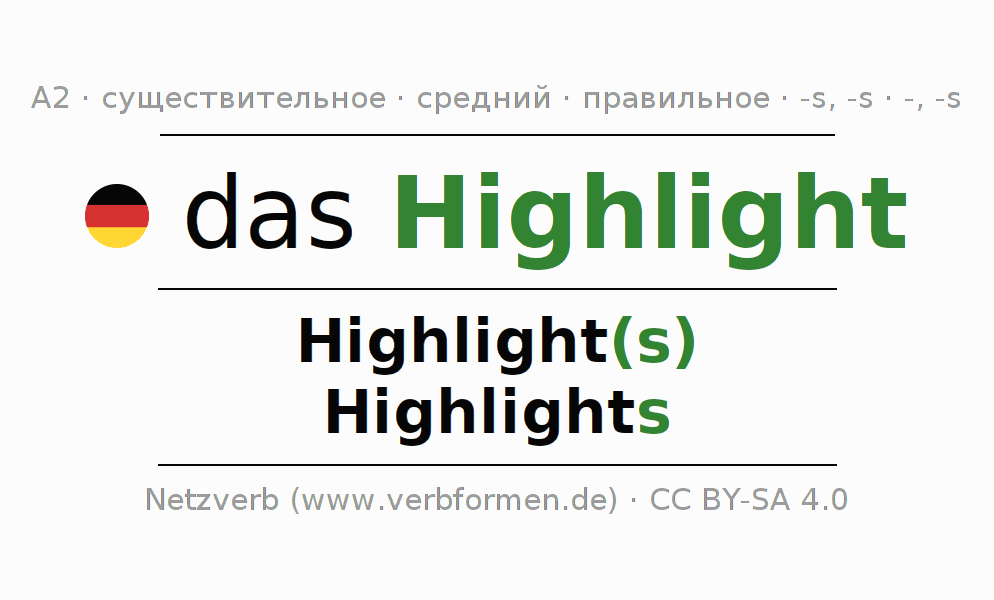 - Множественное число: die Highlights, der Highlights, den Highlights, die Highlights