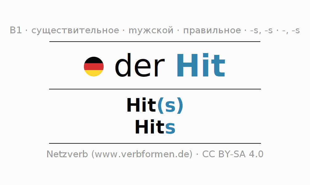 - Множественное число: die Hits, der Hits, den Hits, die Hits
