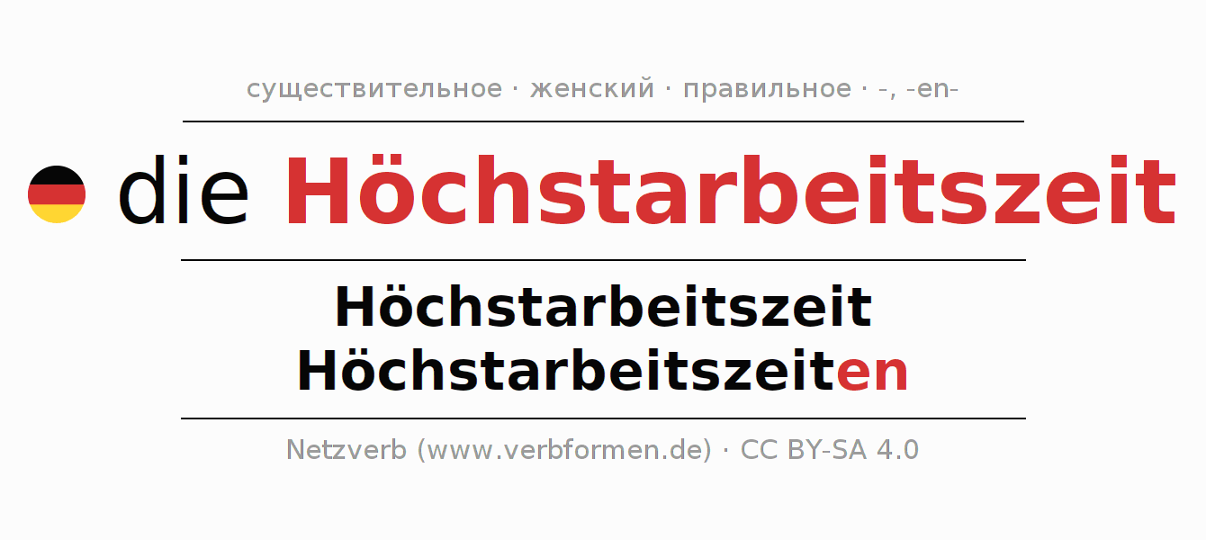 - Единственное число: die Höchstarbeitszeit, der Höchstarbeitszeit, der Höchstarbeitszeit, die Höchstarbeitszeit
