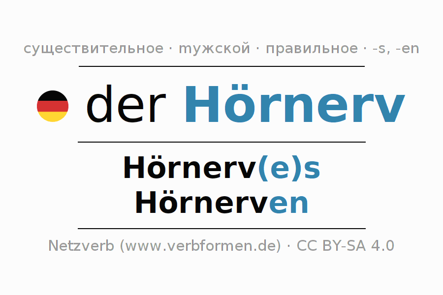 Склонение существительного Hörnerv (слухово́й нерв, слуховой нерв) даётся в родительном падеже единственного числаHörnerv(e)s и в именительном падеже множественного числа Hörnerven. Существительное Hörnerv склоняется по смешанному типу, получая окончания es/en. Грамматический род Hörnerv мужской с определённым артиклем "der" Здесь можно просклонять не только Hörnerv, но и все немецкие существительные. Kомментарии ☆