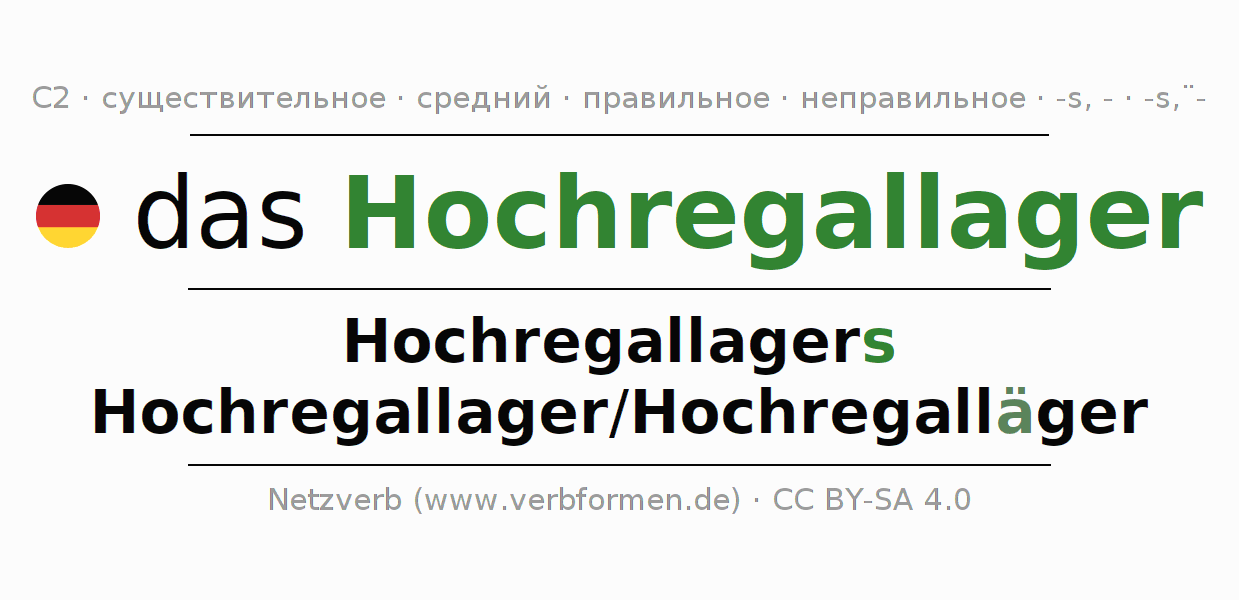 - Единственное число: das Hochregallager, des Hochregallagers, dem Hochregallager, das Hochregallager