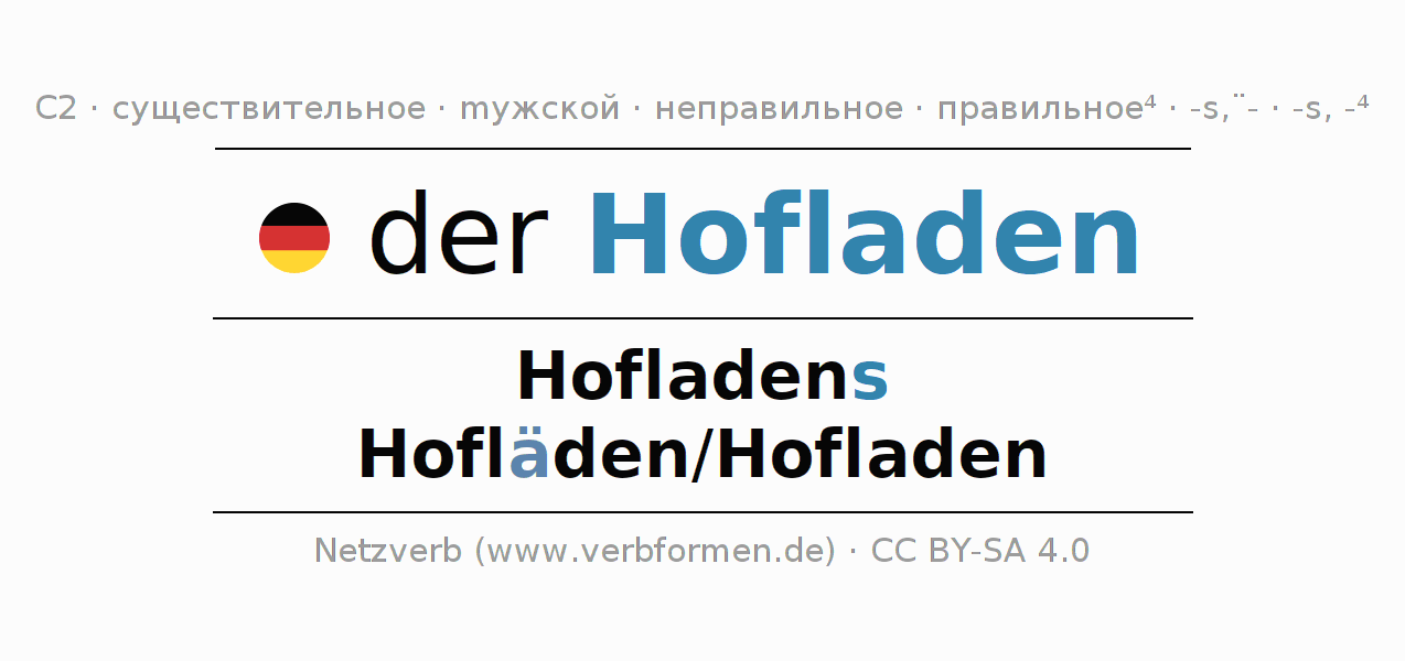- Единственное число: der Hofladen, des Hofladens, dem Hofladen, den Hofladen