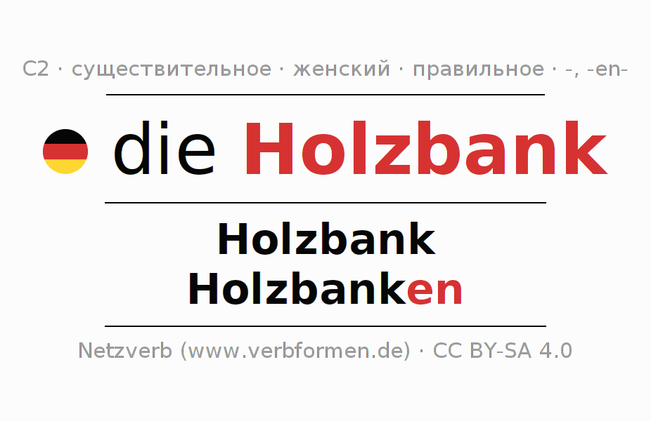 - Множественное число: die Holzbanken, der Holzbanken, den Holzbanken, die Holzbanken