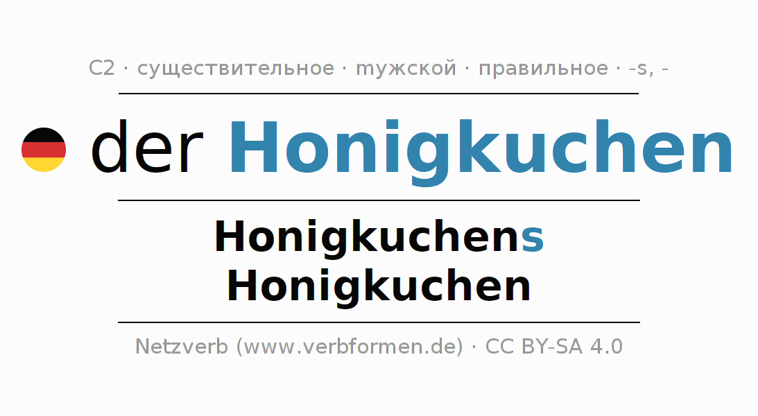 - Единственное число: der Honigkuchen, des Honigkuchens, dem Honigkuchen, den Honigkuchen