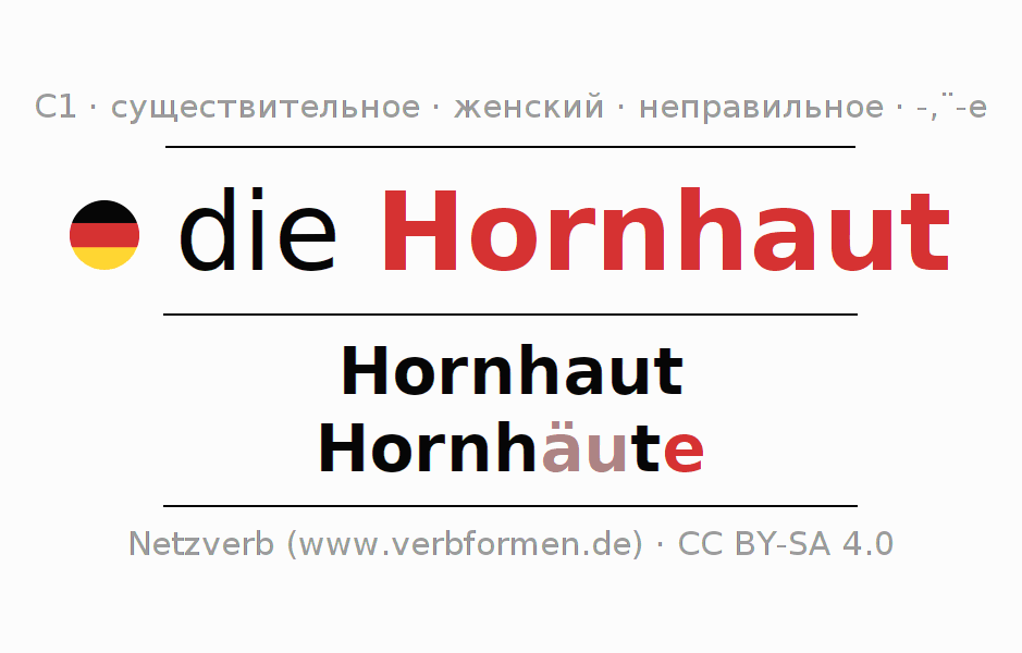 - Единственное число: die Hornhaut, der Hornhaut, der Hornhaut, die Hornhaut