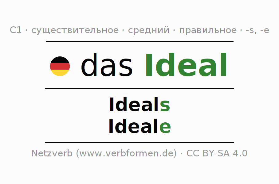 Склонение существительного Ideal (идеал, идеа́л) даётся в родительном падеже единственного числаIdeals и в именительном падеже множественного числа Ideale. Существительное Ideal склоняется по сильному типу, получая окончания s/e. Грамматический род Ideal средний с определённым артиклем "das" Здесь можно просклонять не только Ideal, но и все немецкие существительные. Существительное включён в словарный запас обладателя сертификата знания немецкого языка уровня C1. Kомментарии ☆