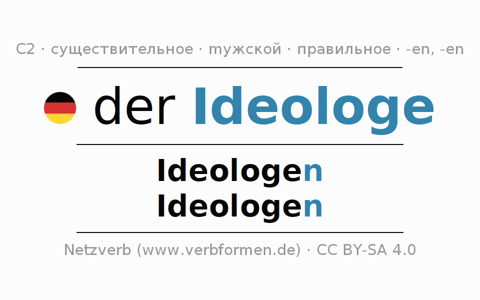 - Единственное число: der Ideologe, des Ideologen, dem Ideologen, den Ideologen
