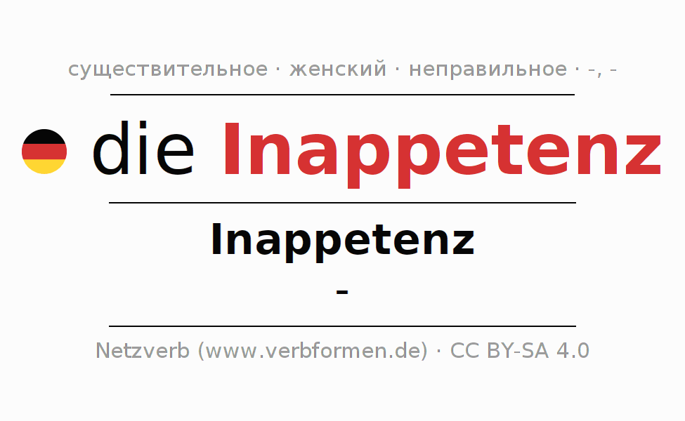 Склонение существительного Inappetenz (аппетит, аппетитосность) даётся в родительном падеже единственного числаInappetenz и в именительном падеже множественного числа -. Существительное Inappetenz при склонении получает окончания -/-. Не образует форм множественного числа. Грамматический род Inappetenz женский с определённым артиклем "die" Здесь можно просклонять не только Inappetenz, но и все немецкие существительные. Kомментарии ☆