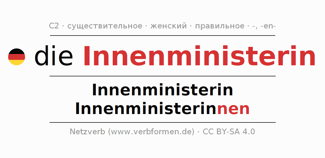 - Множественное число: die Innenministerinnen, der Innenministerinnen, den Innenministerinnen, die Innenministerinnen