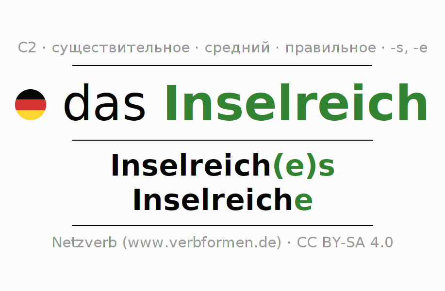 Склонение существительного Inselreich (архипелаг, островна́я импе́рия) даётся в родительном падеже единственного числаInselreich(e)s и в именительном падеже множественного числа Inselreiche. Существительное Inselreich склоняется по сильному типу, получая окончания es/e. Грамматический род Inselreich средний с определённым артиклем "das" Здесь можно просклонять не только Inselreich, но и все немецкие существительные. Существительное включён в словарный запас обладателя сертификата знания немецкого языка уровня C2. Kомментарии ☆