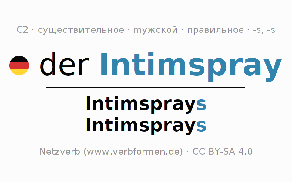- Единственное число: der Intimspray, des Intimsprays, dem Intimspray, den Intimspray