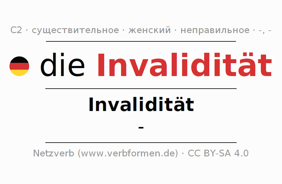 - Единственное число: die Invalidität, der Invalidität, der Invalidität, die Invalidität
