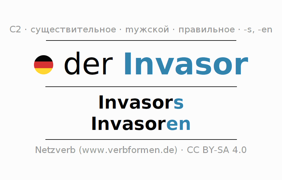 - Единственное число: der Invasor, des Invasors, dem Invasor, den Invasor