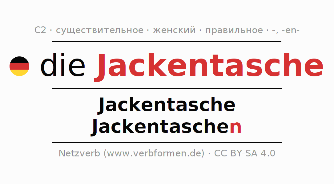 - Множественное число: die Jackentaschen, der Jackentaschen, den Jackentaschen, die Jackentaschen