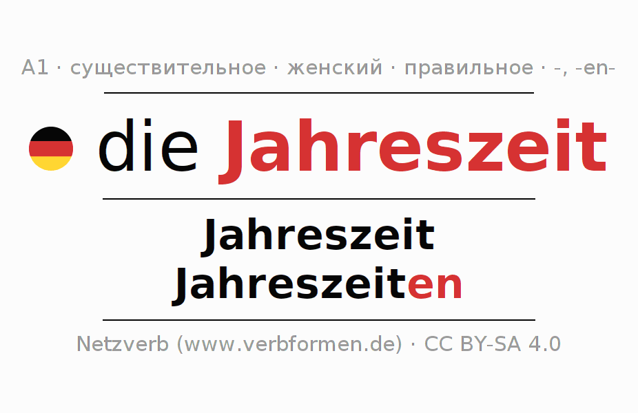 - Множественное число: die Jahreszeiten, der Jahreszeiten, den Jahreszeiten, die Jahreszeiten