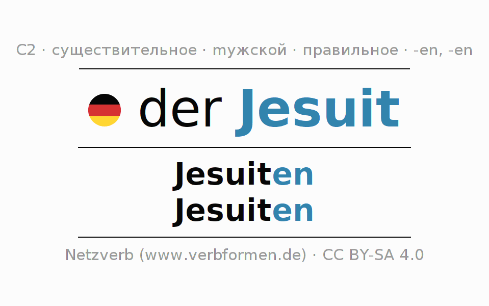 - Множественное число: die Jesuiten, der Jesuiten, den Jesuiten, die Jesuiten