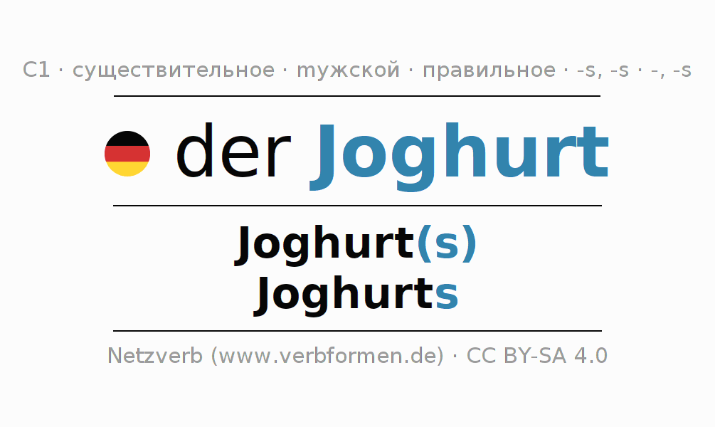 Склонение существительного Joghurt (йогурт, йо́гурт) даётся в родительном падеже единственного числаJoghurt(s) и в именительном падеже множественного числа Joghurts. Существительное Joghurt склоняется по сильному типу, получая окончания s/-/s. Может употребляться и с другими окончаниями. Грамматический род Joghurt мужской с определённым артиклем "der" Однако существительное может употребляться в другом роде и с другим артиклем. Здесь можно просклонять не только Joghurt, но и все немецкие существительные. Существительное включён в словарный запас обладателя сертификата знания немецкого языка уровня C1. Kомментарии ☆