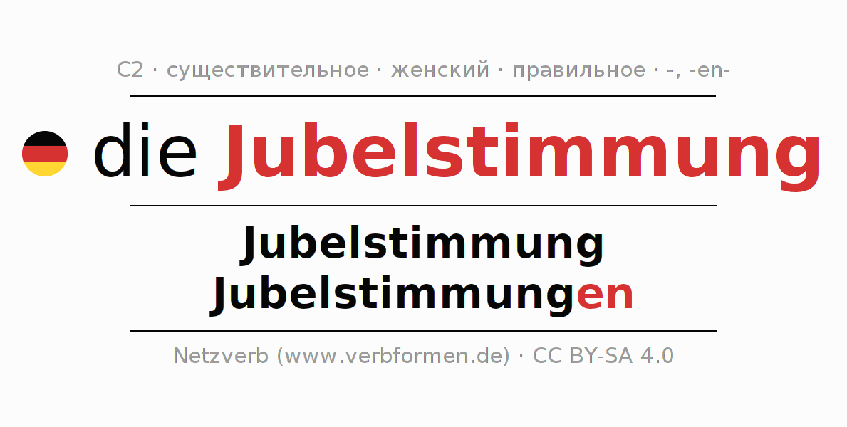 - Единственное число: die Jubelstimmung, der Jubelstimmung, der Jubelstimmung, die Jubelstimmung