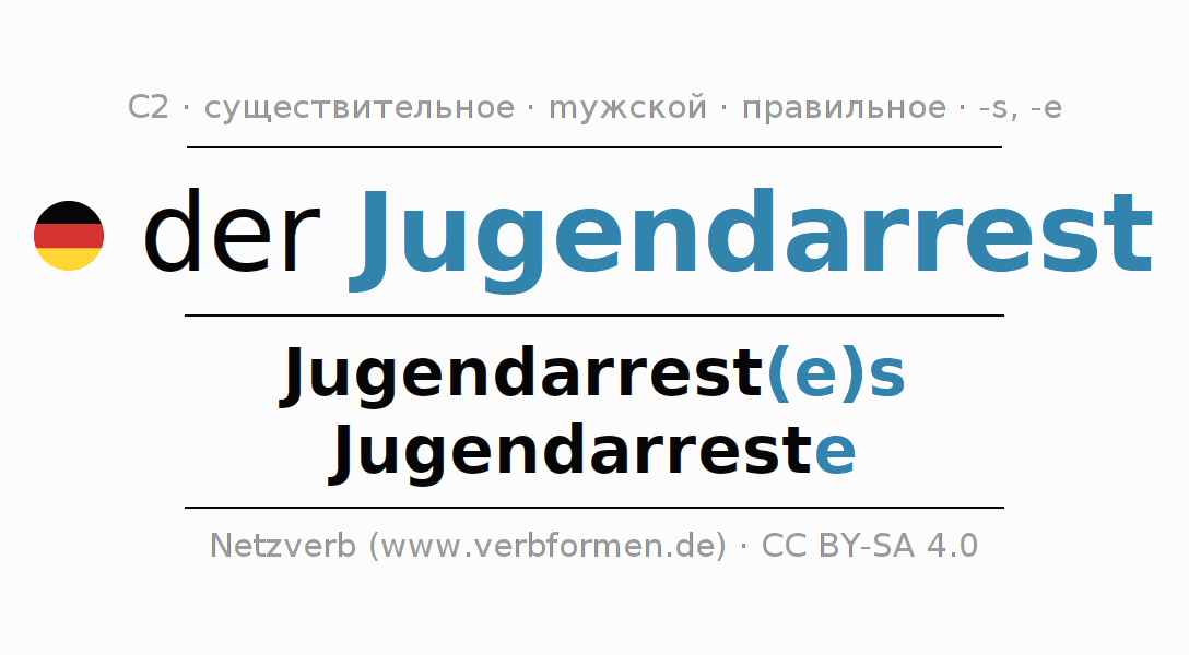 Склонение существительного Jugendarrest (подростковый арест) даётся в родительном падеже единственного числаJugendarrest(e)s и в именительном падеже множественного числа Jugendarreste. Существительное Jugendarrest склоняется по сильному типу, получая окончания es/e. Грамматический род Jugendarrest мужской с определённым артиклем "der" Здесь можно просклонять не только Jugendarrest, но и все немецкие существительные. Существительное включён в словарный запас обладателя сертификата знания немецкого языка уровня C2. Kомментарии ☆
