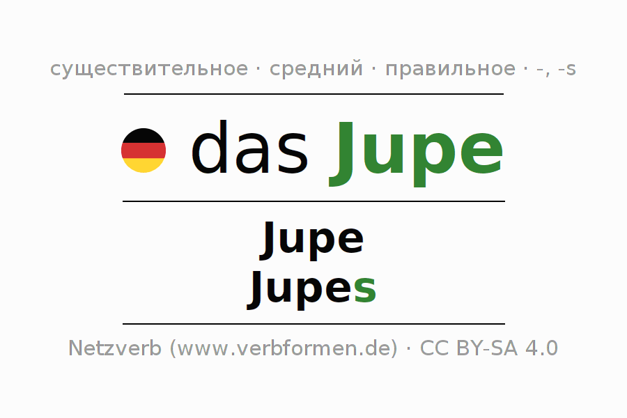 Склонение существительного Jupe даётся в родительном падеже единственного числаJupe и в именительном падеже множественного числа Jupes. Существительное Jupe склоняется по сильному типу, получая окончания -/s. Грамматический род Jupe средний с определённым артиклем "das" Однако существительное может употребляться в другом роде и с другим артиклем. Здесь можно просклонять не только Jupe, но и все немецкие существительные. Kомментарии ☆