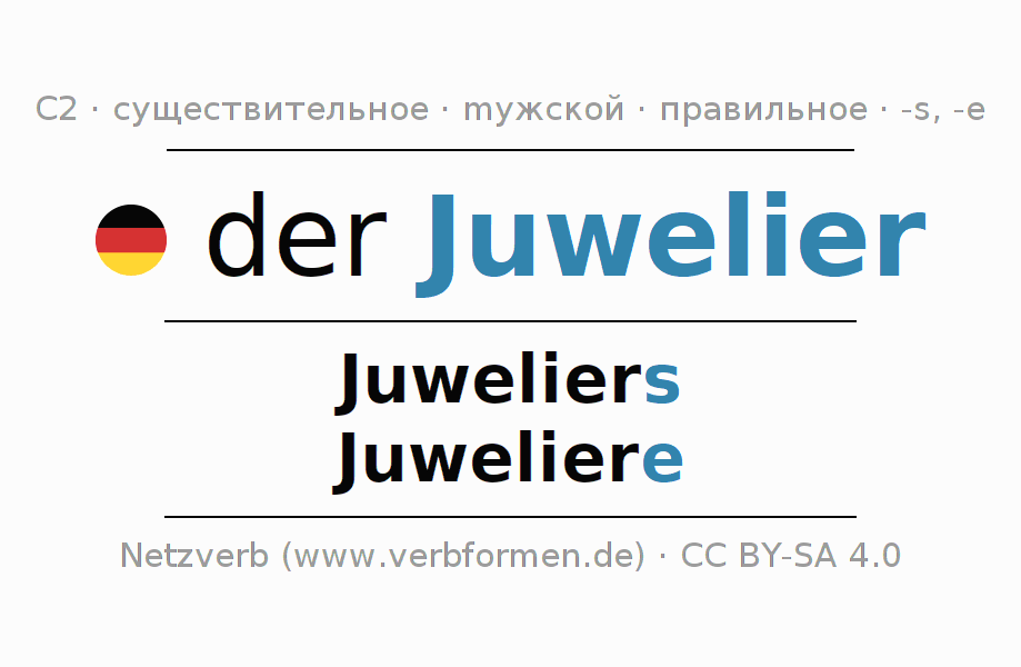 - Единственное число: der Juwelier, des Juweliers, dem Juwelier, den Juwelier