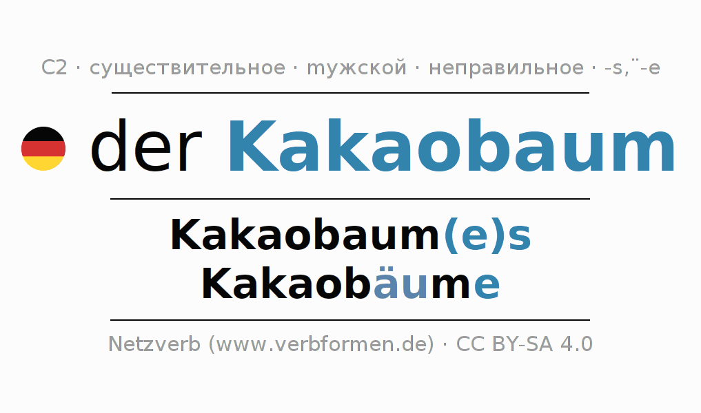 - Множественное число: die Kakaobäume, der Kakaobäume, den Kakaobäumen, die Kakaobäume