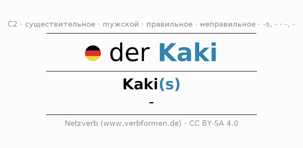 Склонение существительного Kaki (каки) даётся в родительном падеже единственного числаKaki(s) и в именительном падеже множественного числа -. Существительное Kaki склоняется по сильному типу, получая окончания s/-/-. Не образует форм множественного числа. Грамматический род Kaki мужской с определённым артиклем "der" Однако существительное может употребляться в другом роде и с другим артиклем. Здесь можно просклонять не только Kaki, но и все немецкие существительные. Существительное включён в словарный запас обладателя сертификата знания немецкого языка уровня C2. Kомментарии ☆