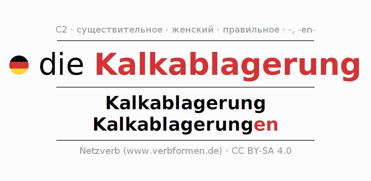 - Множественное число: die Kalkablagerungen, der Kalkablagerungen, den Kalkablagerungen, die Kalkablagerungen