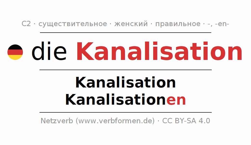 - Единственное число: die Kanalisation, der Kanalisation, der Kanalisation, die Kanalisation