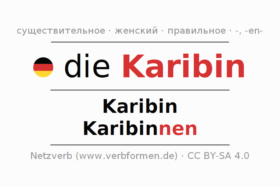 Склонение существительного Karibin даётся в родительном падеже единственного числаKaribin и в именительном падеже множественного числа Karibinnen. Существительное Karibin склоняется по слабому типу, получая окончания -/nen. Грамматический род Karibin женский с определённым артиклем "die" Здесь можно просклонять не только Karibin, но и все немецкие существительные. Kомментарии ☆